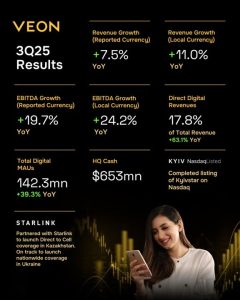 VEON 3Q25 Highlights Total revenue growth of 7.5% year-on-year (“YoY”) to USD 1,115 million. EBITDA growth of 19.7% YoY to...