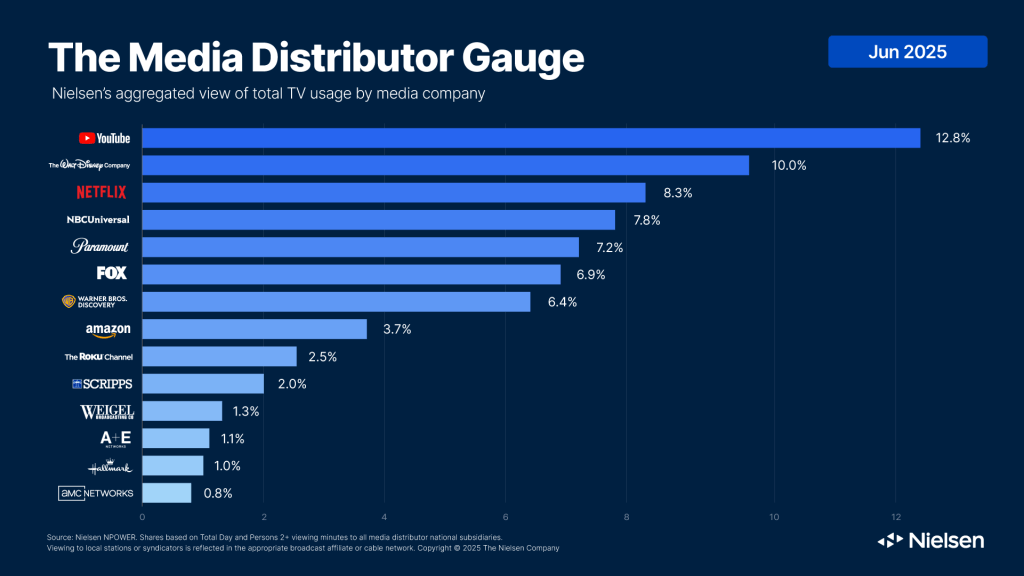 Netflix is on the rise, as the streamer’s share of television viewing in June ranked in the top three among media companies for the first time in Nielsen’s Media Distributor Gauge report. Netflix posted the largest monthly share-increase across all media companies this month, adding 0.8 points from May to represent 8.3% of June’s TV usage total and its largest share of television since January 2025.