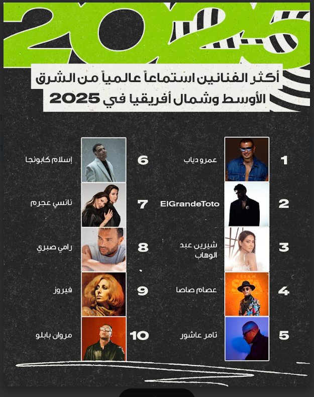 Spotify is sharing the Top Middle East and North Africa Artists and Songs Globally, a list shaped by streams from both inside and outside the region. The list highlights how MENA music traveled in 2025 and what sounds resonated with listeners worldwide.