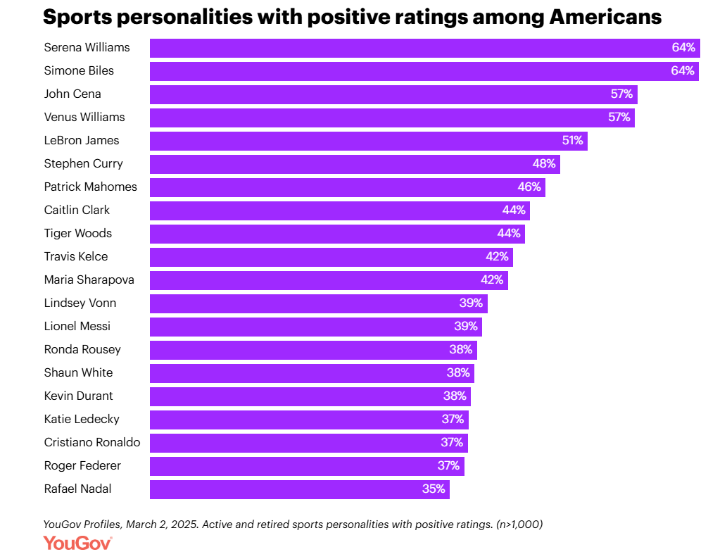 YouGov Ratings data tracks favorability of sports personalities on a 5-point scale and includes a mix of male and female athletes. In the top 20 list of positive ratings for current athletes among US adults, eight of them are female (40%). A variety of sports are represented, including gymnastics, basketball, and tennis, among others. These positive ratings of female athletes indicate that a strong appetite exists for women’s sports.